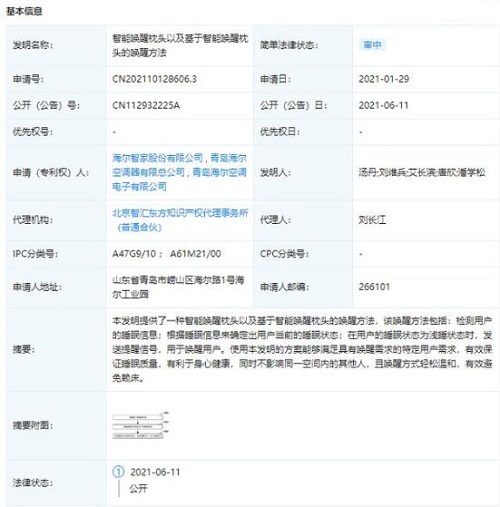 海爾日前公布了一項(xiàng)名為“智能喚醒枕頭以及基于智能喚醒枕頭的喚醒方法”的發(fā)明專利,專利公開號(hào)為CN112932225A。